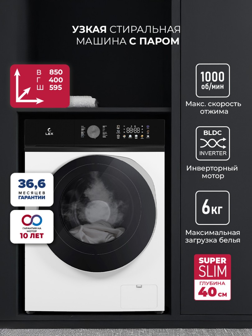 Новая линейка стиральных машин LEX серии Slim — это стильный, надежный и высокотехнологичный помощник для вашего дома, который прослужит вам верой и правдой долгие годы благодаря инверторному мотору и комплектующим высокого качества.