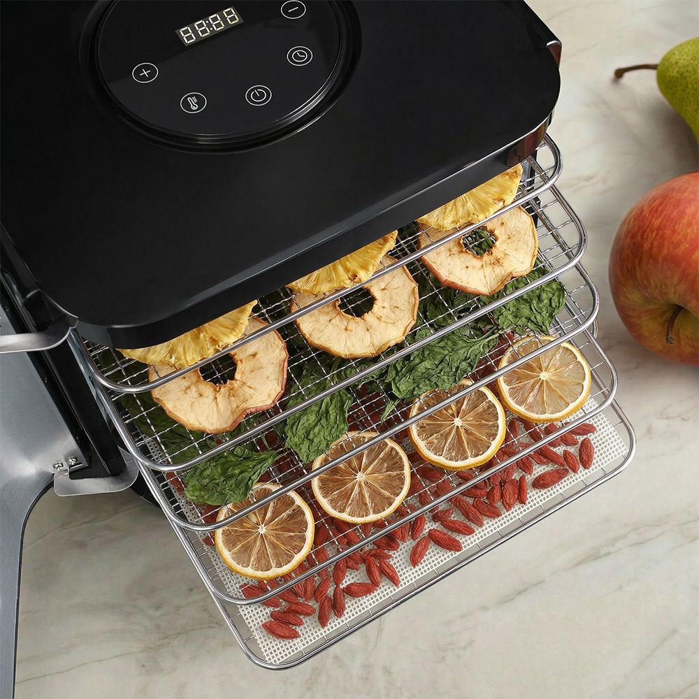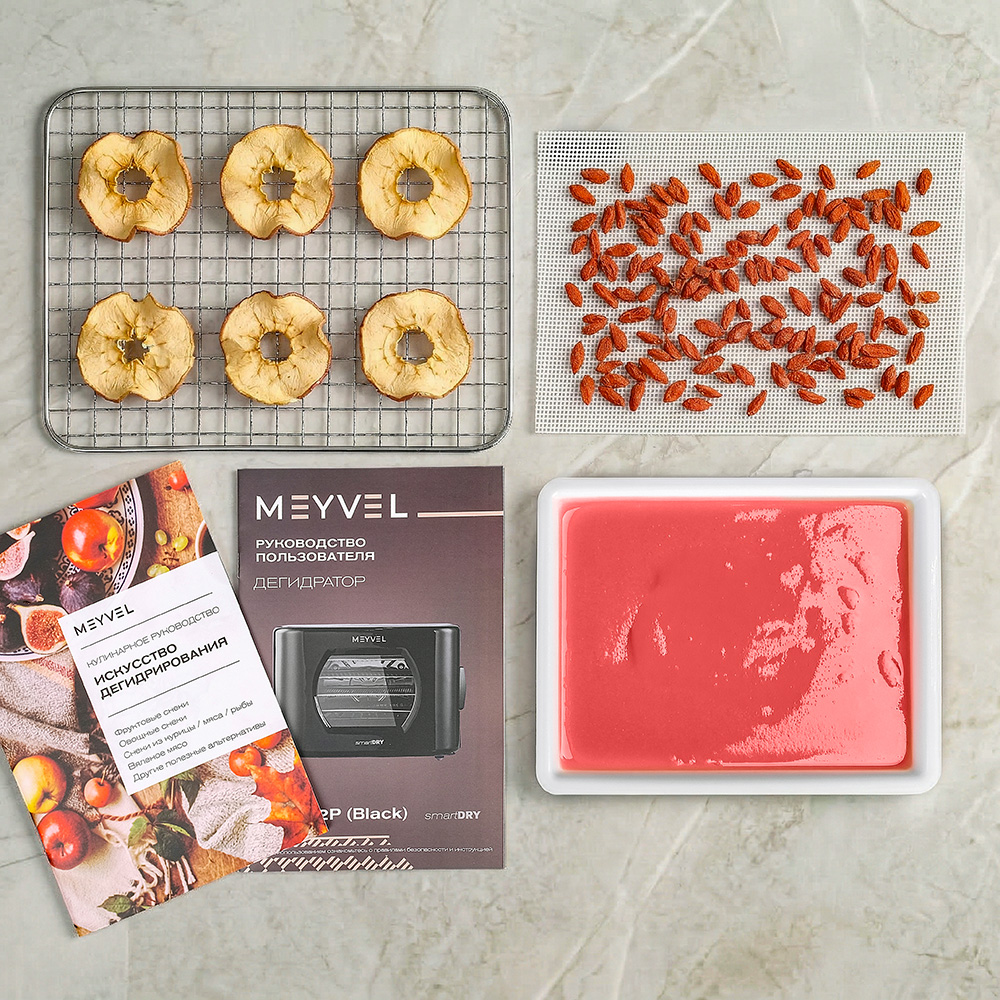 Meyvel MDH5-2P (Чёрный) (Black) подходит тем, кто делает домашние заготовки, придерживается правильного питания или просто любит натуральные снеки без добавок. С его помощью можно готовить фруктовые чипсы, овощные смеси для супов, сушеные ягоды для выпечки, травяные сборы и мясные закуски. Один прибор закрывает множество задач и помогает по-новому взглянуть на привычные продукты.