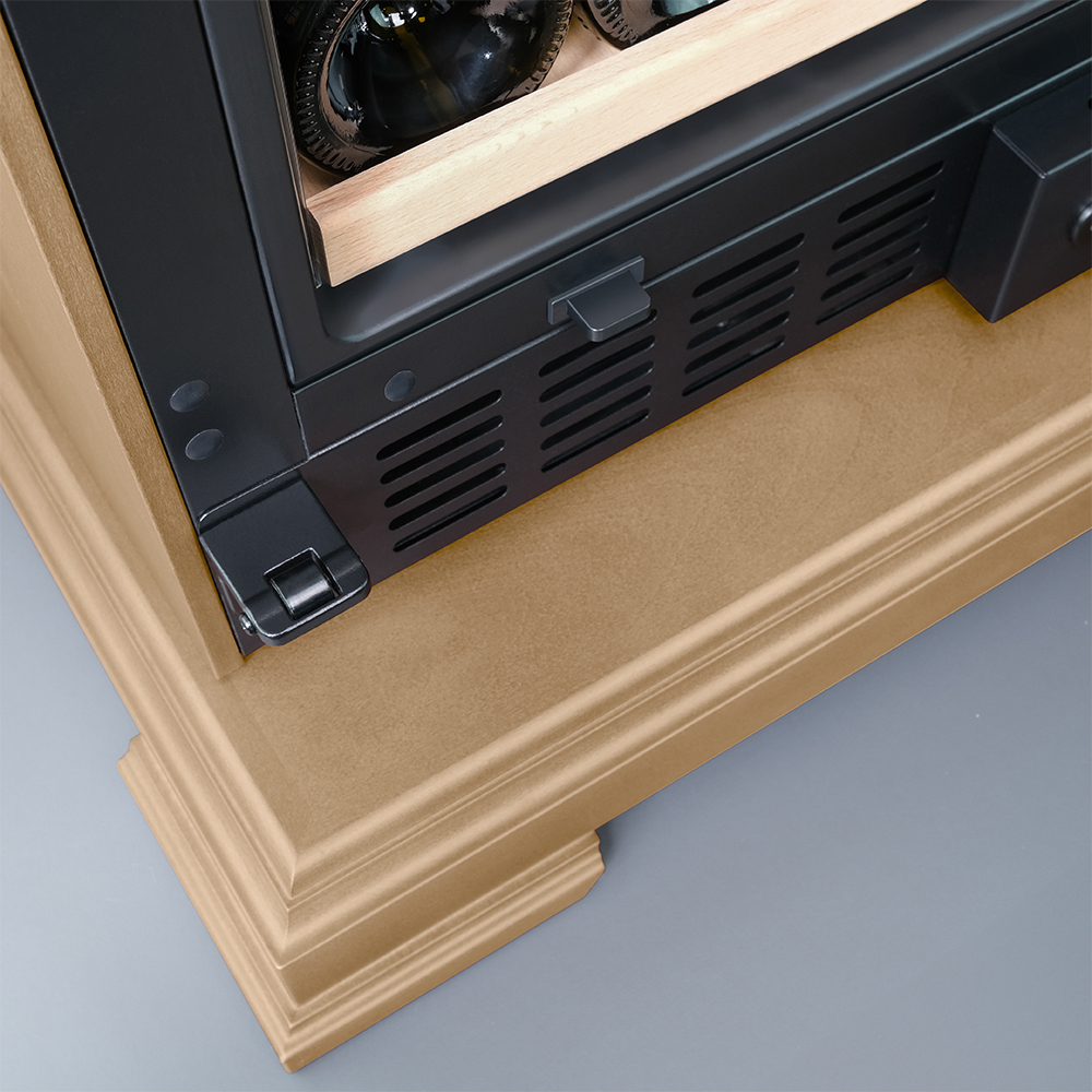 Полки выполнены из массива бука. Этот натуральный и крепкий материал не только имеет красивую текстуру, но и прекрасно гасит небольшую вибрацию. Так что Ваше вино будет храниться в абсолютном покое.