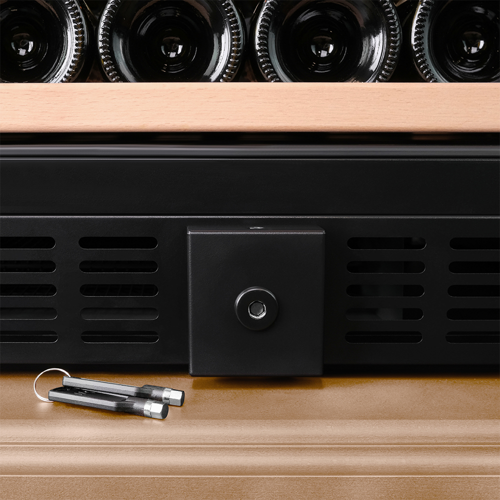 Винный холодильник оснащён надёжным и экономичным компрессором. Есть ручка, вентиляционная решётка и замок.